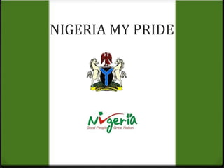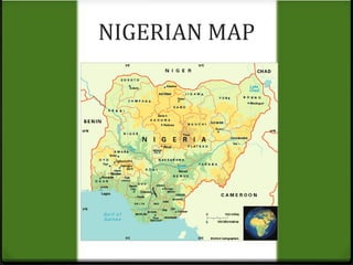 This document provides an overview of Nigeria, including its location in West Africa between Benin and Niger, population of over 150 million, and history of becoming an independent nation in 1960. It discusses Nigeria's political divisions into 36 states and 774 local government areas organized into six geographical zones. The document also summarizes Nigeria's major ethnic groups, languages, religions, climate affected by tropical winds and rainfall, vegetation zones, drainage system including the Niger River, education system, mineral resources such as oil and gas, tourism attractions, major cities including Lagos and Abuja, and the state of Bauchi including its capital city and my school located there.