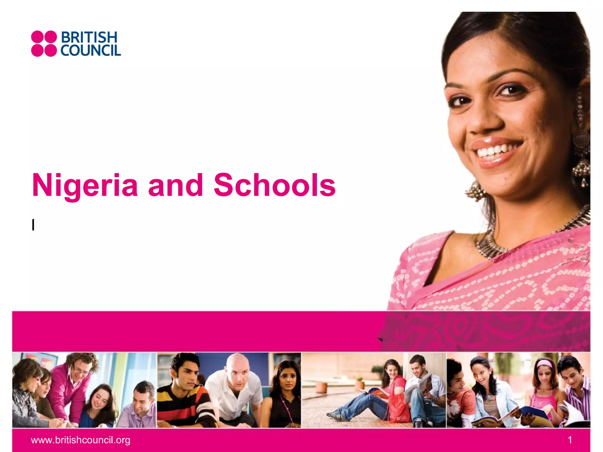 This document provides information about education in Nigeria. It notes that Nigeria has a population of over 170 million people from 389 ethnic groups. Education follows a 9-3-4 system with 6 years of primary education, 3 years of junior secondary, and further optional education. While 10% of local budgets are dedicated to education, infrastructure, skills gaps, inadequate staffing, and low attendance pose challenges. School partnerships through Connecting Classrooms can provide cultural exchange, professional development for teachers, and international learning experiences for students.