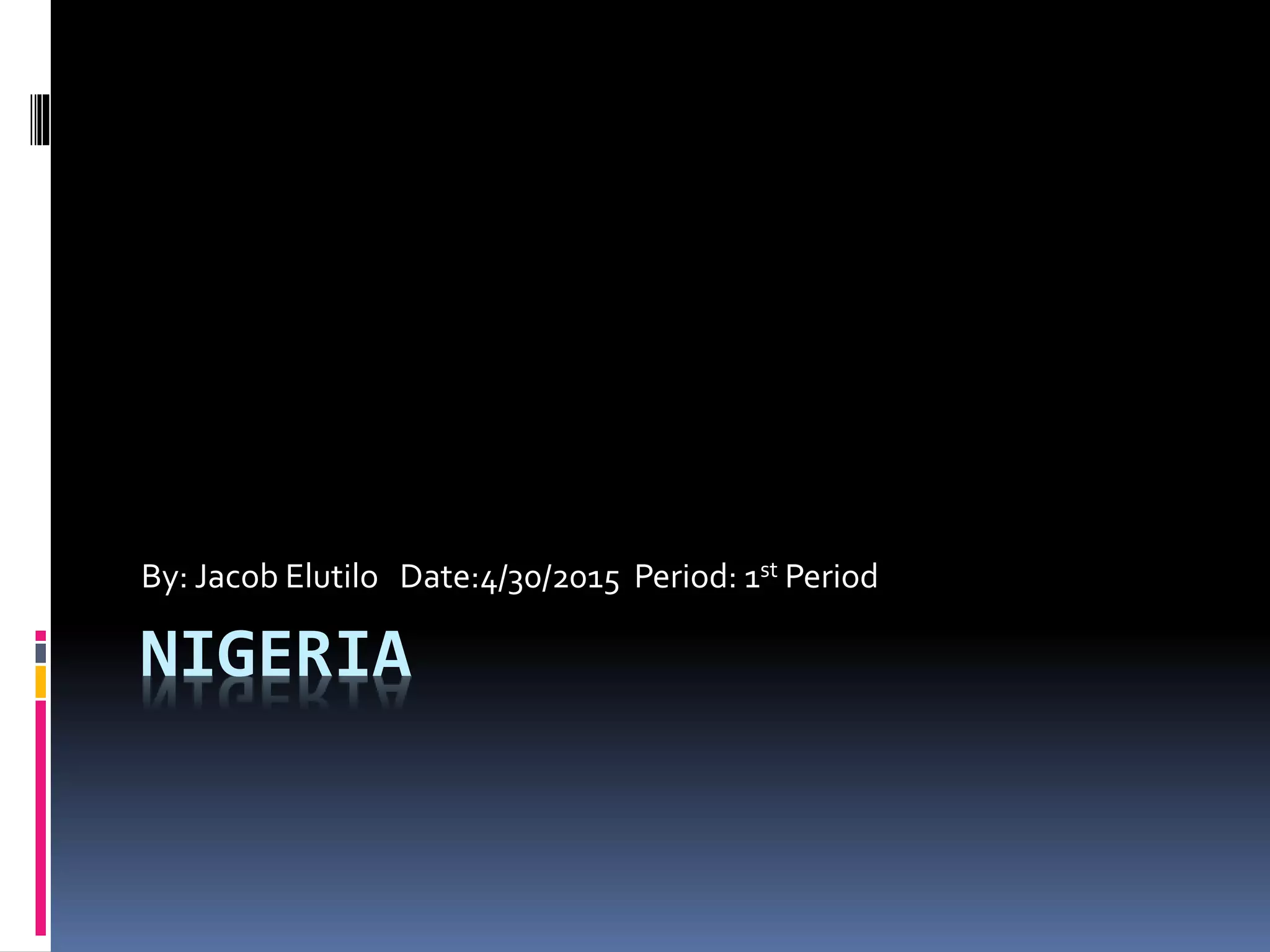 Nigeria is located in West Africa between Benin and Cameroon. Its capital is Abuja and most population lives in Lagos and Abuja. The country has multiple languages including Yoruba and Ibo and the population is around 177 million, with Islam and Christianity being the major religions. Nigeria has a federal republic government with Goodluck Jonathan as president and a bicameral legislature. It has a mixed economy focused on agriculture and natural resources like petroleum and gas.