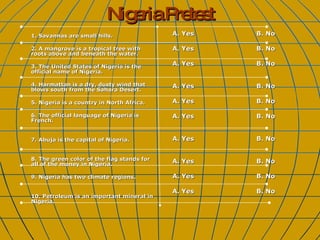 Nigeria is a country located in West Africa along the Gulf of Guinea. It has a long coastline and many rivers and creeks along the coast that are lined with mangrove swamps. Traveling inland, the landscape changes to tropical rainforest and then savannas and highlands in the center of the country. Nigeria has a tropical climate with two main regions - the south receives high rainfall year-round while the north has a dry season when the harmattan wind blows south from the Sahara Desert. Nigeria has a population of over 128 million people from several hundred ethnic groups and it is Africa's most populous country.