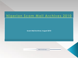 The document discusses various Nigerian scam emails, including messages from individuals claiming to have access to large sums of abandoned money from deceased persons, seeking assistance to transfer these funds into the recipient's account. Each email outlines an elaborate story to convince the recipient to participate in the scam, promising a significant percentage of the funds in return for their cooperation. The scams highlight the use of fabricated identities and urgent language to elicit a response and exploit unsuspecting victims.