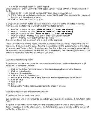 This document provides instructions for the night audit process at a Hampton Inn hotel. It includes 30 steps to complete tasks in the front desk (FD) and night audit (NA) applications, such as verifying cash is closed out, running reports, suspending interfaces, performing autopost and close out, and applying payments for departures. The goal is to reconcile accounts, post revenues, back up transactions, and prepare reports to balance revenues and complete the nightly close out process.