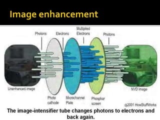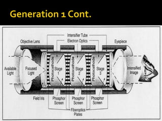 Night vision devices were first created during World War II to help with night operations. They functioned by placing infrared filters over searchlights. Since then, technology has advanced through generations. Generation 1 used intensified natural light while Generation 2 added microchannel plate electron multipliers in the 1970s. Currently, Generation 3 and 4 devices provide clearer, longer lasting images but Generation 4 has shorter life. Night vision devices were originally for military use but are now commonly used for civilian applications such as law enforcement, hunting, security, and navigation.