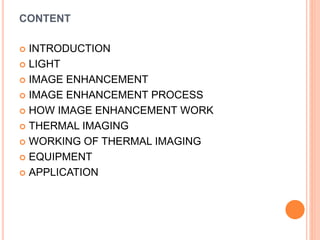 The document outlines night vision technology, explaining its two principal methods: image enhancement and thermal imaging, which operate on different portions of the infrared light spectrum. Image enhancement amplifies low levels of light, while thermal imaging detects heat emitted by objects. The technology is utilized in various applications including military, hunting, security, and wildlife observation.