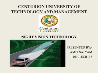 This document discusses night vision technology. It describes how night vision devices work by either amplifying available light through image intensification or detecting infrared radiation through thermal imaging. Night vision devices are classified into generations based on improvements in image resolution and light amplification. Generation 3 devices offer the best performance with gallium arsenide photocathodes and microchannel plates providing high resolution images. Night vision has military and civilian applications in low-light conditions for tasks such as navigation, surveillance and hunting.