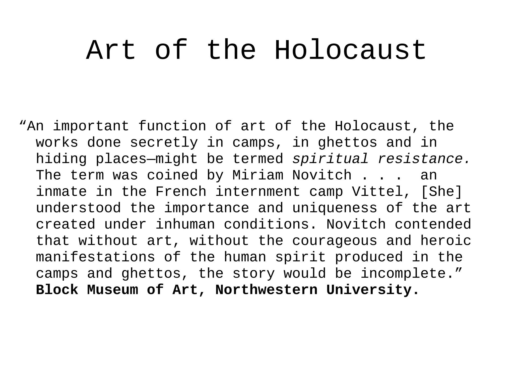 Art created during the Holocaust served as a form of spiritual resistance according to the document. Works made secretly in camps, ghettos, and hiding places told an important part of the story by manifesting the human spirit through art despite facing inhuman conditions. This view was coined by Miriam Novitch, who understood the significance and uniqueness of art made during the Holocaust while interned in a French camp.