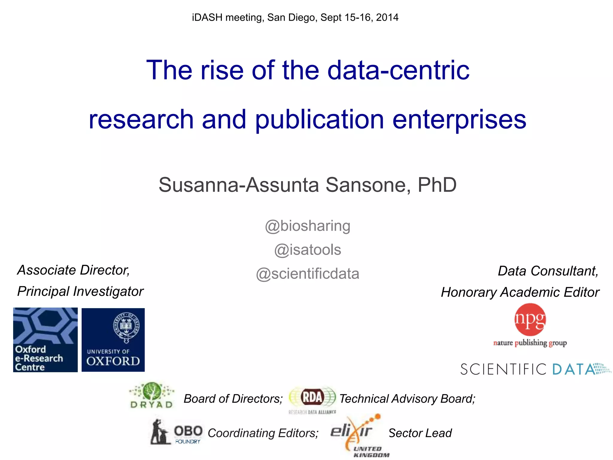 1) The document discusses Susanna-Assunta Sansone's roles and work related to promoting FAIR data standards and practices.
