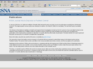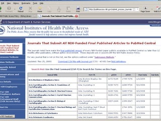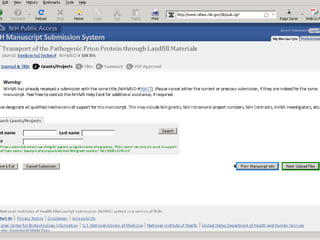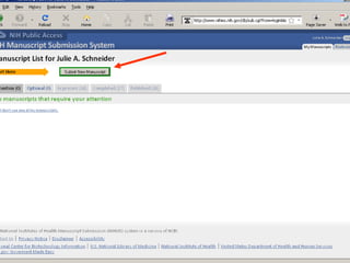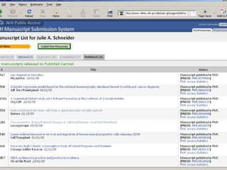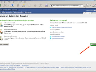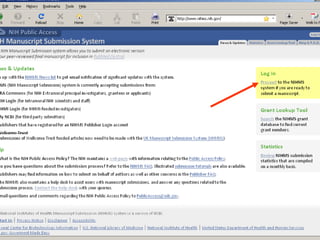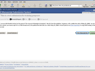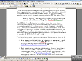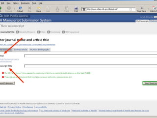 The document summarizes the NIH Public Access Policy, which requires investigators funded by NIH to submit the final peer-reviewed manuscripts of their published work to the National Library of Medicine’s PubMed Central database within 12 months of publication. It provides details on complying with the policy, submitting manuscripts through the NIH Manuscript Submission System, and using citation management tools like EndNote and RefWorks to track submissions.