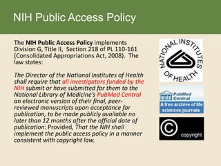 This document discusses the NIH Public Access Policy and how to comply using My NCBI and the RPPR. It provides an overview of the policy, how to associate publications with grants in My NCBI and the RPPR, and assistance available for MD Anderson faculty and staff. Key steps include addressing copyright, depositing papers in PubMed Central, adding citations to My Bibliography, and associating publications with grants in reporting. The Research Medical Library can help with depositing papers and understanding the policy's requirements.