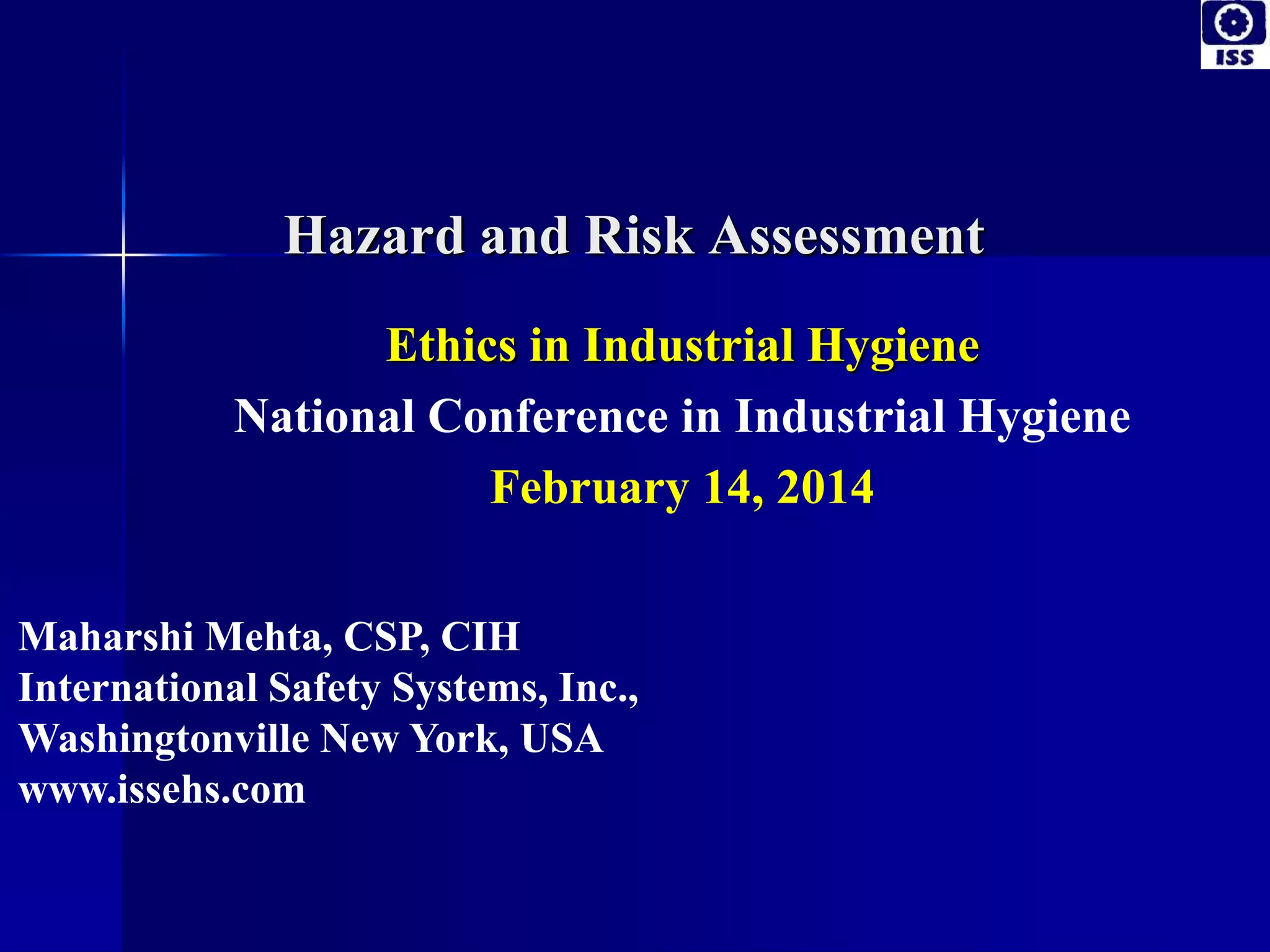 This document outlines an agenda and presentation on ethics in industrial hygiene. It discusses current issues like erroneous exposure data and lack of reliable sampling methods in 50% of workplaces. It emphasizes the need for ethics from both professional and personal perspectives. Case studies are presented on the impacts of unethical behavior by companies like Enron. Dilemmas are discussed around sampling conditions, seeking peer review, accepting gifts, and actions when witnessing ethical violations. The conclusion emphasizes implementing ethics by listening to one's inner voice.