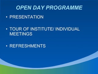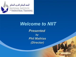 The document introduces NIIT's open day program which includes a presentation, institute tour, and individual meetings. It outlines NIIT's vision to be the top choice for industrial training by working closely with industry, providing practical hands-on training, and developing real skills in trainees. The credentials of NIIT include partnerships with large UK colleges and qualified industrial experienced staff. The training uses UK vocational standards and includes a work ethics program. Phase one focuses on engineering training which has three levels and four types, with options for full-time or part-time attendance. Training includes practical, theory, and key skills elements. NIIT also offers a wide range of short courses in office/secretarial, technical, management
