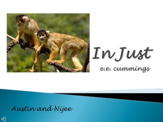 In this poem, e.e. cummings describes springtime and children playing. The "queer old balloonman" whistles in the spring, calling out to children like "eddieandbill" and "bettyandisbel" who come out to play hopscotch, jumprope, and marbles when they hear his call. The balloonman's whistling and the children's playful games illustrate the lighthearted fun of the spring season.