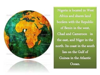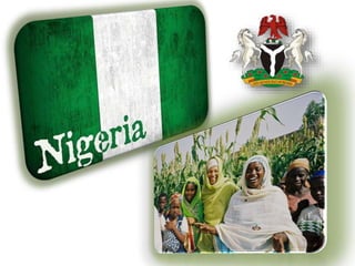 The document provides an overview of Nigeria, covering its geographic regions, demographic composition, economy, major cities, cuisine, education, sports, and cultural festivals. It highlights that Muslims make up 60% of the population, with a significant presence of Christians in the south, and emphasizes Nigeria's diverse climate and economy based on agriculture and oil. Additionally, it touches on sports, noting that football is particularly important, and describes traditional wedding customs and notable national festivals.