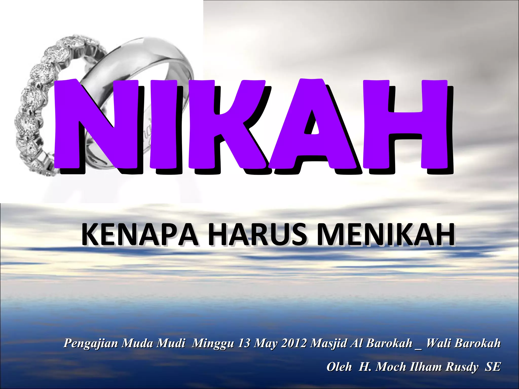 Dokumen ini menjelaskan pentingnya menikah dalam perspektif agama, termasuk keutamaan menikah, cara menjaga kehormatan, dan pahala yang didapatkan melalui pernikahan. Pernikahan dianggap sebagai cara untuk menyempurnakan agama dan memberikan pahala bagi pasangan dalam berbagai aspek kehidupan. Selain itu, dokumen menekankan pentingnya memilih pasangan berdasarkan agama dan menunjukkan hak serta tanggung jawab dalam pernikahan.