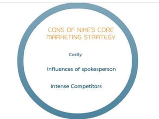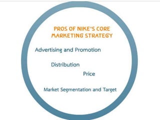 Nike is an American company that designs, manufactures and markets athletic footwear, apparel, equipment and accessories worldwide. It targets athletes with products like shoes and clothing and positions itself as a premium brand focused on quality and performance. Nike's marketing strategy involves maintaining market leadership through innovative products, strategic partnerships and endorsements with athletes to promote the brand globally across various marketing channels. The document discusses Nike's marketing mix and seeks to outline potential pros, cons and risks of its core marketing approach.