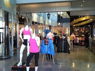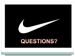 The document provides details about the NikeTown store located at 300 Newbury St in Boston, MA. It describes the store's prime location with two entrances and large size allowing for multiple departments and displays. It notes the spacious layout without aisles and stocking of a large amount of inventory across men's, women's, and various sport categories. The document also summarizes consumer perceptions of Nike, including likes for innovative designs but dislikes when styles change too rapidly, as well as differences in technology and benefits between Nike and other shoe brands.