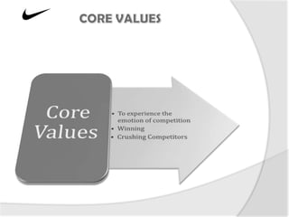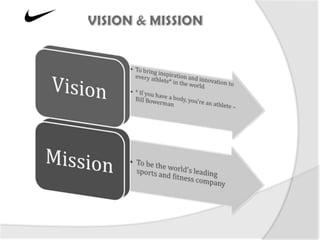 Nike is a major sportswear and equipment company founded in 1964. It is headquartered in Oregon and has annual revenue over $19 billion. Nike designs and distributes shoes, apparel, and sports equipment and has a slogan of "Just Do It!". It has over 34,000 employees and operates factories around the world. Nike President and CEO Mark Parker leads the company which owns brands like Converse and Hurley.