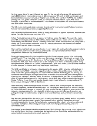 NIKE reported strong financial results for Q2 FY07 with 10% revenue growth and 12% growth in earnings per share. Revenue increased in all regions and business units led by 11% growth in both apparel and equipment. Futures orders were up 7% globally. Mark Parker expressed confidence in NIKE's strategies and ability to drive continued growth and competitive advantage through focus on key categories and innovation. Don Blair provided details on the financials including gross margin stabilization, tax benefits from an agreement with the Dutch government, and shareholder returns through dividends and share repurchases totaling $776 million year-to-date. Inventories remained an area of focus with 15% growth attributed partly to currency fluctuations.
