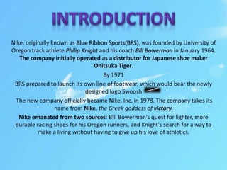 Nike began as a company focused on designing comfortable running shoes for athletes when most other shoe companies only designed shoes for everyday wear. It positioned itself as the most valuable sports brand known for premium quality, innovative design, and being technically advanced. Nike grew significantly using the strategy of appealing to people's desire to live healthily and view themselves as athletes. It aimed to satisfy customers' needs for comfort, quality, and status through high-performance products. Nike has faced challenges marketing in Asia but addressed this by promoting running as a social activity and launching new campaigns.