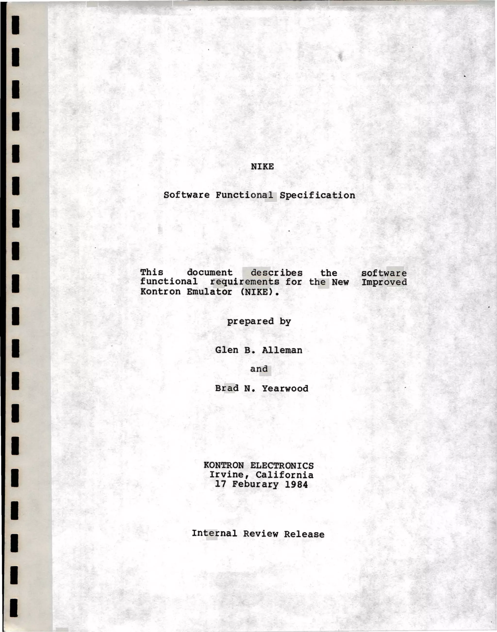 This document provides a functional specification for the New Kontron Emulator (NIKE). It describes the intended functions of the Development WorkBench (DWB) software, which provides an environment for software development, debugging, and emulation. The DWB is intended to operate various emulators and instruments to enable debugging of embedded software programs. It utilizes a graphical user interface with windows, menus, and mouse input. The document outlines the high-level software components and mechanisms needed to implement the DWB system.