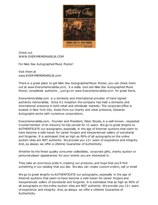 Everymemorabilia.com sells authentic autographed memorabilia such as a Nikki Sixx autographed music poster. The company has been in business for over 12 years and works to authenticate items, especially those sold online where forgeries are common. The company's president, Peter Boyde, is respected in the industry and they provide a lifetime guarantee of authenticity for their items. They sell to both consumers and corporations and can also create custom orders.