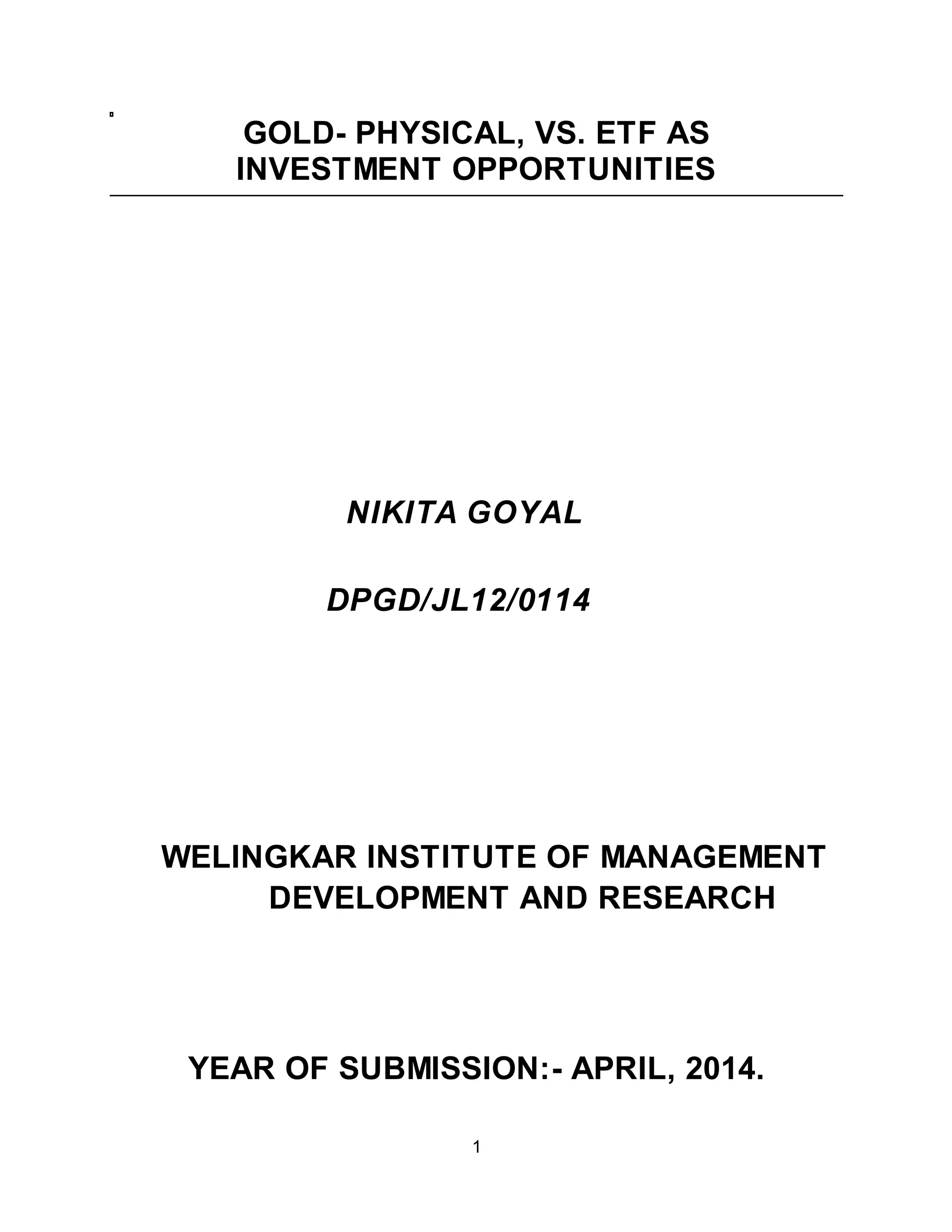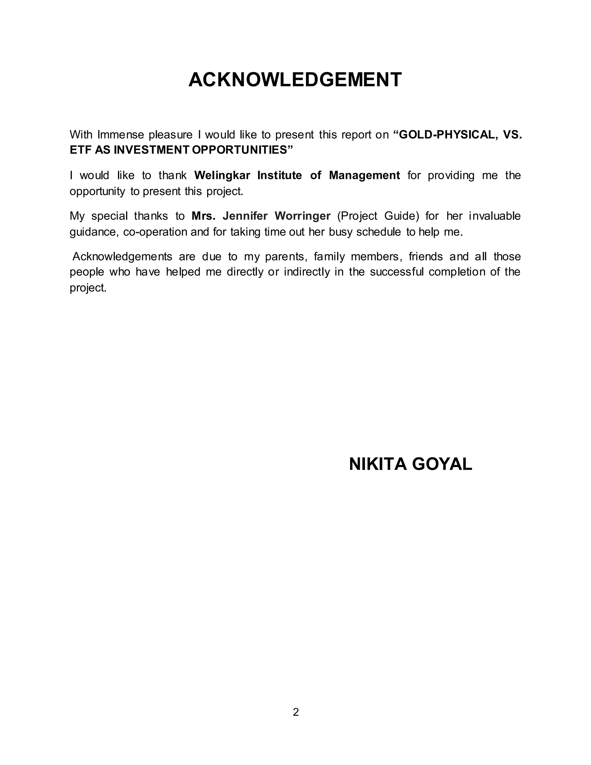 This document is a student project report on comparing physical gold and gold exchange-traded funds (ETFs) as investment opportunities. It includes an acknowledgements section thanking the project guide and institute. It also includes a certificate from the guide certifying the project. The report will cover an introduction to investments and gold, the advantages and disadvantages of physical gold, an introduction to gold ETFs, and a comparison of physical gold and gold ETFs as investments. It will analyze the options through case studies and literature review before providing conclusions and recommendations.