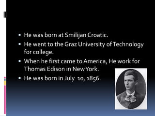 Nikola Tesla was a Serbian American inventor, electrical engineer, mechanical engineer, and futurist best known for his contributions to the design of the modern alternating current (AC) electricity supply system. He was born in 1856 in Croatia and studied engineering at the Graz University of Technology before moving to the United States to work for Thomas Edison. Some of Tesla's greatest inventions included the AC motor and developments in wireless energy transmission. He died in 1943 at the age of 86.