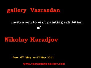 Gallery Vazrazdan is hosting a painting exhibition of Nikolay Karadjov from May 7th to 27th, 2013. Karadjov was born in 1950 in Pleven, Bulgaria and is known for his cool, melancholic paintings of people and still lifes that depict a sense of loneliness and romantic elegance. The rigidity of his painted women and the liveliness of his painted statues create an surreal atmosphere in his works that intrigues viewers. Gallery Vazrazdan is located in Plovdiv, Bulgaria and invites visitors to view the exhibition in person or online.