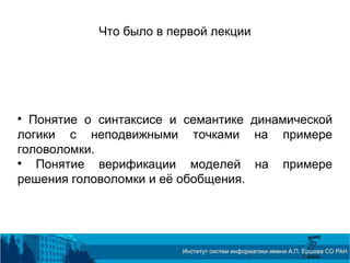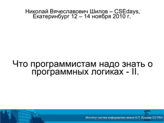 Доклад Николая Шилова на CSEDays обсуждает верификацию моделей в динамической логике с неподвижными точками и методы уменьшения размеров моделей через симметрию и числовую абстракцию. Приведены примеры решения головоломки о фальшивых монетах и представление формул в контексте игр и логик. Также рассматриваются философские аспекты программной верификации, включая преимущества и недостатки различных логик, таких как ПДЛ и CTL.