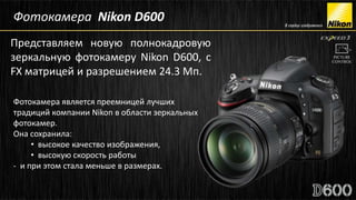 Фотокамера Nikon D600 представляет собой полнокадровую зеркальную модель с 24,3 МП и улучшенной системой автофокуса. Она предлагает высокое качество изображения, возможность записи видео в формате 1080p и улучшенное шумоподавление. Также камера поддерживает Wi-Fi, позволяя легко передавать снимки и управлять ею с мобильного устройства.