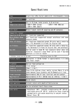 This document provides specifications for a Nikon single-lens reflex digital camera with interchangeable lenses. Key details include an effective pixel count of 6.1 million, compatibility with Nikkor F-mount lenses, autofocus and exposure capabilities, storage on CompactFlash memory cards, and power supplied by one EN-EL3 battery. Measurements of the camera body are also listed.