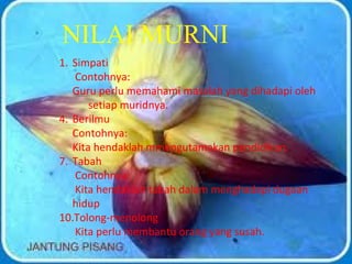Dokumen ini membahas nilai-nilai murni seperti simpati, ilmu, ketabahan, dan tolong-menolong. Contoh-contoh diberikan untuk masing-masing nilai sebagai panduan dalam pendidikan dan interaksi sosial. Penekanan pada pentingnya memahami masalah orang lain dan memberikan bantuan.