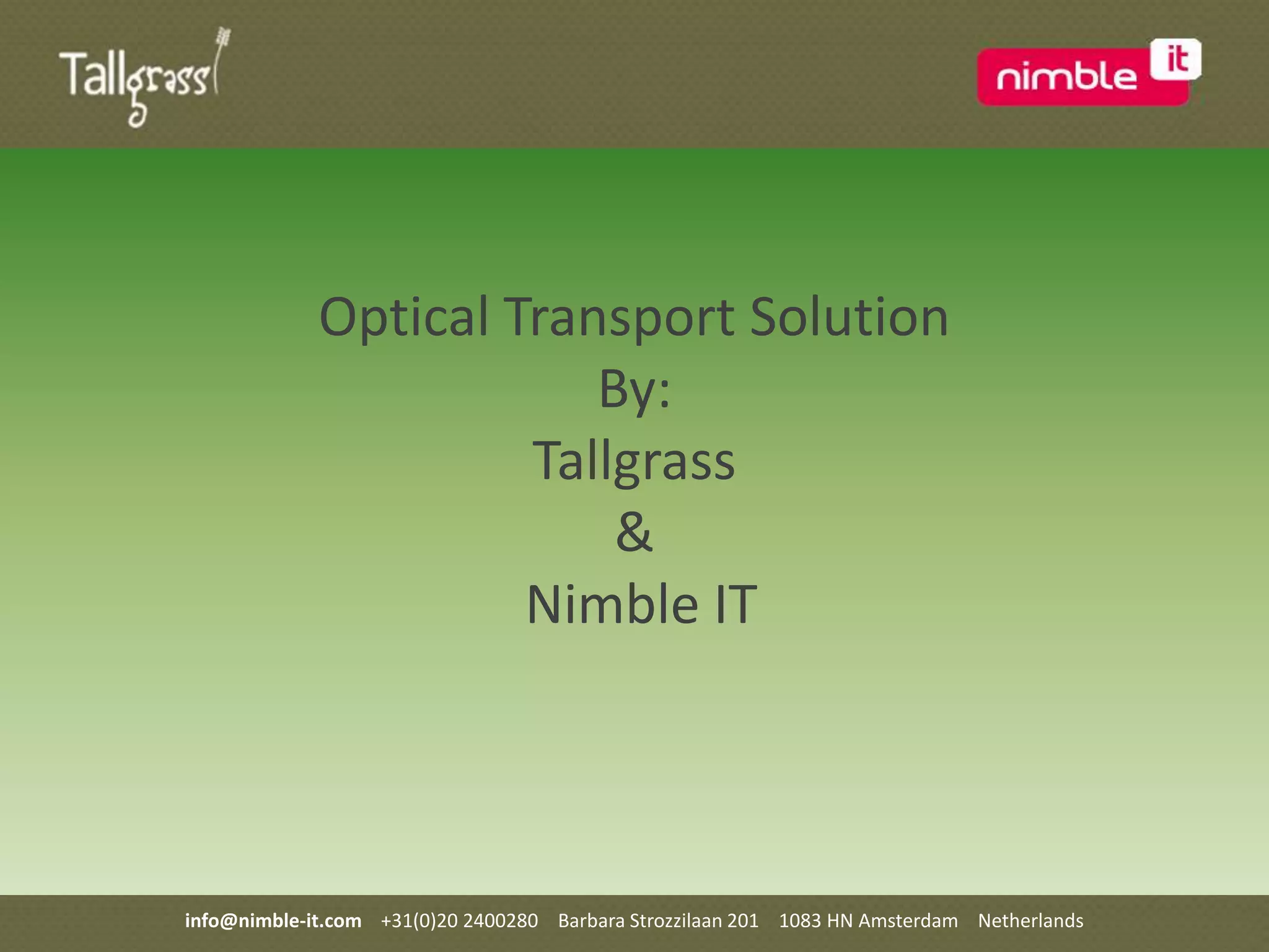 Tallgrass and Nimble IT provide optical transport solutions including CWDM and DWDM wavelength division multiplexing to increase fiber bandwidth. They offer training on fiber optic communication principles and applications. Testing services include dispersion measurement, inspection and optical time domain reflectometry to ensure link quality before deployment. Equipment and services cover passive and active components, wavelength division multiplexing, fiber-to-the-home networks, and transceivers.