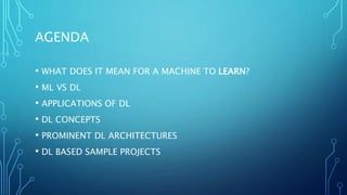 Deep learning uses multilayered neural networks to process information in a robust, generalizable, and scalable way. It has various applications including image recognition, sentiment analysis, machine translation, and more. Deep learning concepts include computational graphs, artificial neural networks, and optimization techniques like gradient descent. Prominent deep learning architectures include convolutional neural networks, recurrent neural networks, autoencoders, and generative adversarial networks.