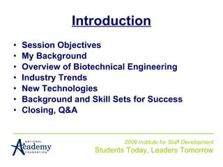 The document summarizes a presentation about careers in biotechnical engineering. It discusses trends in the field like tissue engineering and targeted drug delivery. It provides an overview of the biotech industry and common career paths, including research and development roles. Education requirements are also summarized, with examples of typical coursework for a biomedical engineering degree.