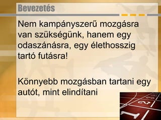 BevezetésNem kampányszerű mozgásravan szükségünk, hanem egy odaszánásra, egy élethosszig tartó futásra!Könnyebb mozgásban tartani egy autót, mint elindítani