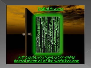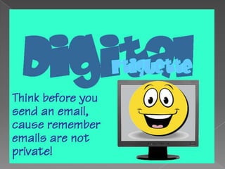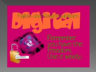 This document discusses 9 key aspects of digital citizenship: digital access, security, literacy, rights and responsibility, communication, health and wellness, commerce, law, and etiquette. It provides overviews and advice for each topic. The overviews explain the importance of equal digital access for all, taking security precautions online, continually learning new tech skills, understanding both rights and responsibilities in the digital world, being aware of digital commerce, maintaining eye and mental health when using devices, only engaging in legal and ethical online behaviors, and demonstrating good digital etiquette. The advice emphasizes using technology responsibly, protecting information, adapting to new tech, being a careful consumer, proper ergonomics, and not misusing technology.