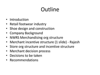 This document provides an overview of merchandising at Nine West Retail Stores. It discusses the retail footwear industry, Nine West's company background and growth, their merchandising organization structure, and the merchant decision process. Key points include that Nine West was founded in 1977 and had over 7,000 retail stores globally by 1996. Their merchandising organization was divided regionally with retail directors overseeing 50-60 stores each. Merchant incentives were based on sales goals and company earnings. The merchant decision process took around 10 months and involved demand forecasting, seasonal budgeting, product selection, pricing strategies, and markdowns. Recommendations focused on expanding into lifestyle products through acquisitions or licensing.