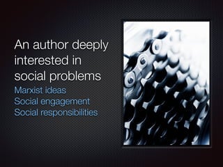 George Orwell was an author deeply interested in social problems who believed writers had a responsibility to engage with and respond to what was happening around them. His dystopian novel Nineteen Eighty-Four, set in a future totalitarian society in 1984, portrayed a frightening vision of a world without freedom, privacy, or independent thought where even language is controlled and distorted to manipulate people. The protagonist Winston Smith tries to rebel against the oppressive dictatorship through love and memory but is ultimately broken physically and mentally by the overwhelming power of the totalitarian state embodied by Big Brother. Orwell aimed to warn readers about the dangers of dictatorship, lack of freedom, and how power could be used to control thought and distort language.