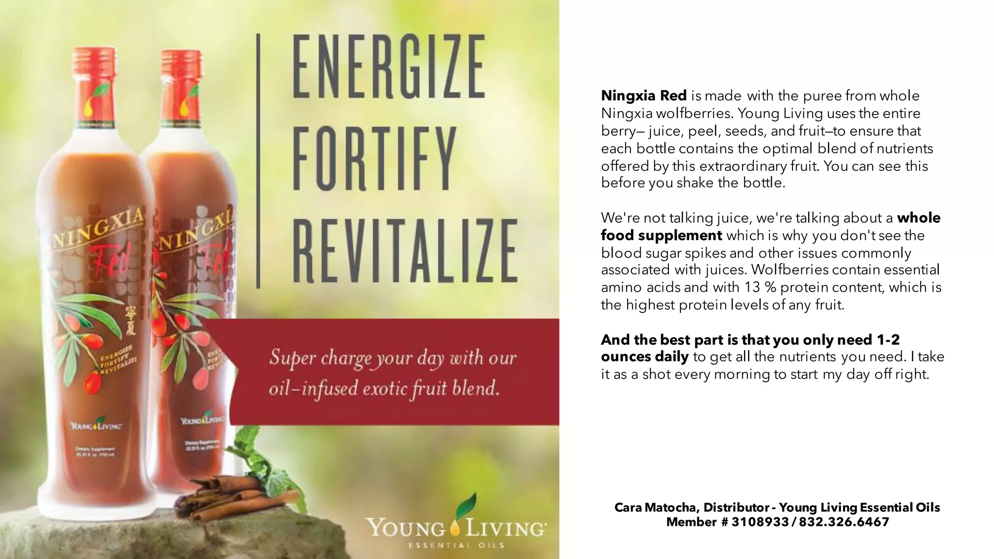 Ningxia Red is a supplement drink made from the whole Ningxia wolfberry, including the juice, peel, seeds, and fruit. It contains the optimal blend of nutrients from this berry, including essential amino acids and the highest protein levels of any fruit at 13%. Ningxia Red is a highly absorbable source of nutrition that can be taken daily in 1-2 ounce servings to support overall health and wellness.