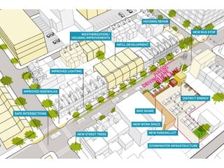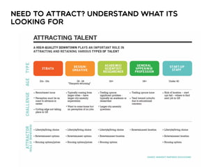 The document summarizes key points about developing an innovation ecosystem and talent attraction strategies. It notes that innovation activity alone is not enough, and that growing creative enterprises depends on attracting talent, which is drawn to places with career opportunities and desirable lifestyles. An effective strategy involves building a destination community where talent wants to both live and work. The document also provides examples of factors that contribute to innovation hubs like Kendall Square in Boston.