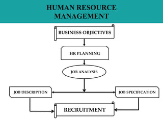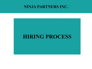 The document outlines Ninja Partners Inc.'s recruitment and selection process, which consists of 7 key elements: identifying hiring needs, preparing job descriptions, sourcing and advertising vacancies, screening and shortlisting applicants, testing and interviewing candidates, finalizing and approving offers, and onboarding new hires. It describes the company's employment classifications, sources of recruitment both internal and external, selection methods including testing, information gathering, and structured interviews, and provides a step-by-step overview of the recruitment process from sourcing to onboarding.