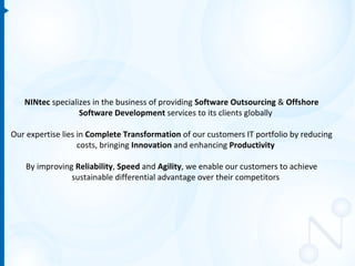 NINtec specializes in providing software outsourcing and offshore software development services globally. Their expertise lies in transforming customers' IT portfolios by reducing costs, bringing innovation, and enhancing productivity. By improving reliability, speed, and agility, NINtec enables customers to achieve sustainable advantages over their competitors.