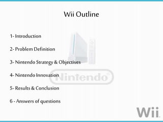 The document outlines Nintendo's historical development from its founding in 1889 as a playing card manufacturer to its challenges in the late 1990s due to competition from Sony and Microsoft. It details Nintendo's strategic focus on ease of use and appeal to new customer segments, leading to innovations like the Wii, which incorporated motion-sensing technology and targeted entertainment seekers. The document highlights the company's objectives to improve profits, customer relationships, and product design, culminating in significant sales successes like the Wii Fit.