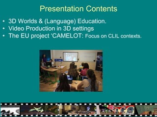 The document discusses the integration of 3D video production into language education, highlighting the EU project 'Camelot' which focuses on enhancing language learning through virtual environments. It outlines the benefits of machinima, fostering creativity, collaborative skills, and enhancing teacher autonomy while providing a variety of educational resources for developing language and intercultural competencies. Additionally, it emphasizes the role of student-generated content and innovative teaching methods to facilitate modern language education.