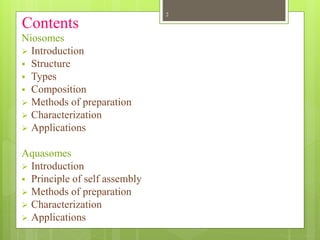 This document provides an overview of Niosomes and Aquasomes as novel drug delivery systems. Niosomes are vesicle systems composed of non-ionic surfactants that can encapsulate medications. They are prepared using methods like ether injection, thin film hydration, sonication, and offer advantages over liposomes. Aquasomes are three-layered, self-assembled nanoparticle structures with a solid inorganic core coated with oligomers and bioactive molecules. Both systems can be characterized and show applications in targeted drug delivery, diagnostics, and improving drug stability and efficacy.