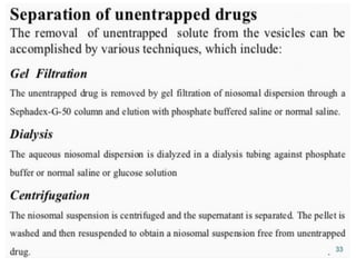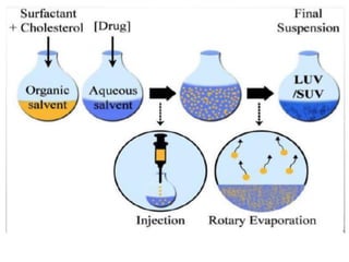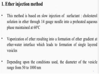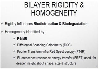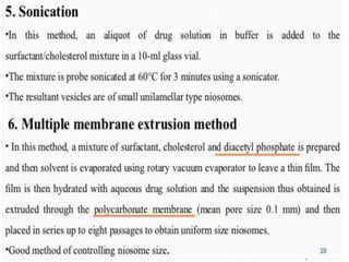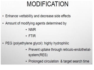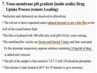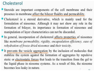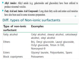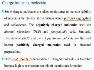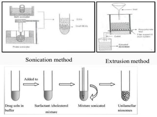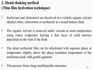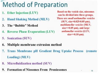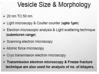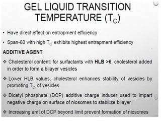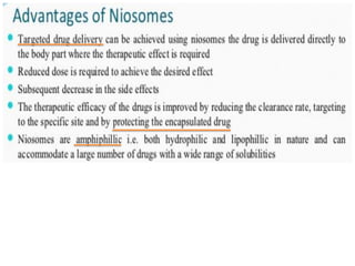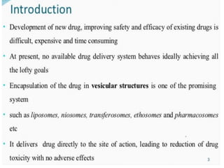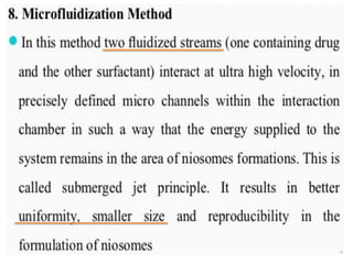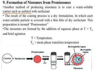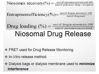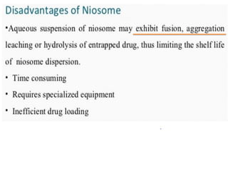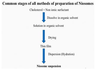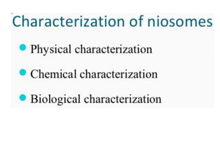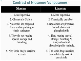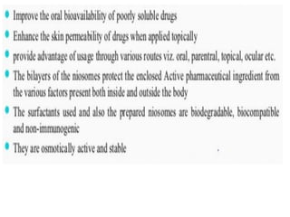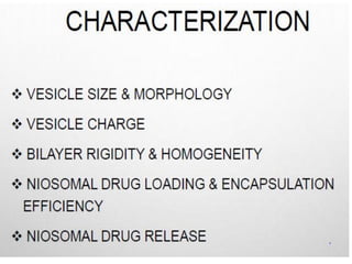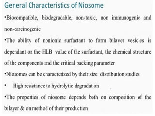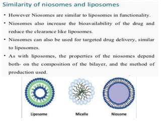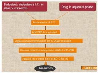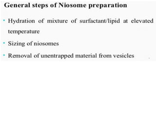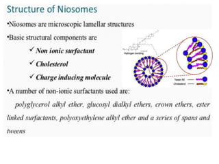 Niosomes are non-ionic surfactant-based vesicles that can be used to deliver drugs. They are divided into small unilamellar vesicles, large unilamellar vesicles, and multi-lamellar vesicles based on their size and number of bilayers. Niosomes can be used for controlled drug release, to improve drug stability and bioavailability, and for targeted drug delivery to tissues like the liver, spleen, and tumors. They have applications in drug delivery via various routes of administration like oral, topical, and intravenous delivery.