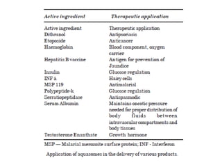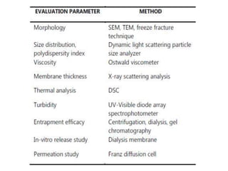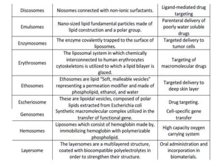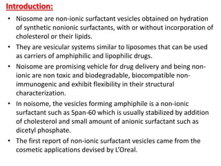 This document discusses niosomes, which are non-ionic surfactant vesicles that can be used as drug carriers. Niosomes are formed using cholesterol and nonionic surfactants through techniques like thin film hydration, sonication, microfluidization. They can encapsulate both hydrophilic and lipophilic drugs. Compared to liposomes, niosomes are more stable and less expensive to produce. Niosomes show potential for targeted drug delivery and sustained release, making them a promising drug delivery system.