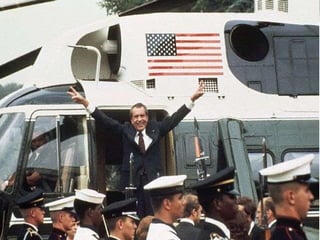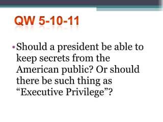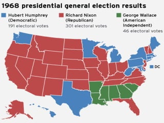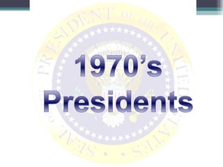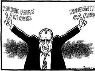 The document discusses Richard Nixon's presidency and the Watergate scandal that led to his resignation. It describes how Nixon pursued a "Southern Strategy" and policy of "New Federalism" to decentralize power. However, his administration was overwhelmed by the Watergate break-in scandal after it was revealed that Nixon had tried to cover it up. Facing impeachment, Nixon resigned in 1974 and was replaced by Vice President Gerald Ford, who pardoned Nixon in an attempt to move past the scandal but saw his approval ratings drop as a result.