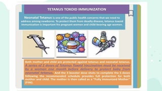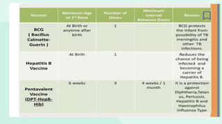 The National Immunization Program was launched in July 1976 by the Department of Health in collaboration with WHO and UNICEF. Its primary goal is to decrease morbidity and mortality in infants and children caused by seven childhood diseases through a specific vaccination schedule. Vaccines include BCG, Hepatitis B at birth, multiple doses of OPV, Penta, and measles vaccines at designated ages.